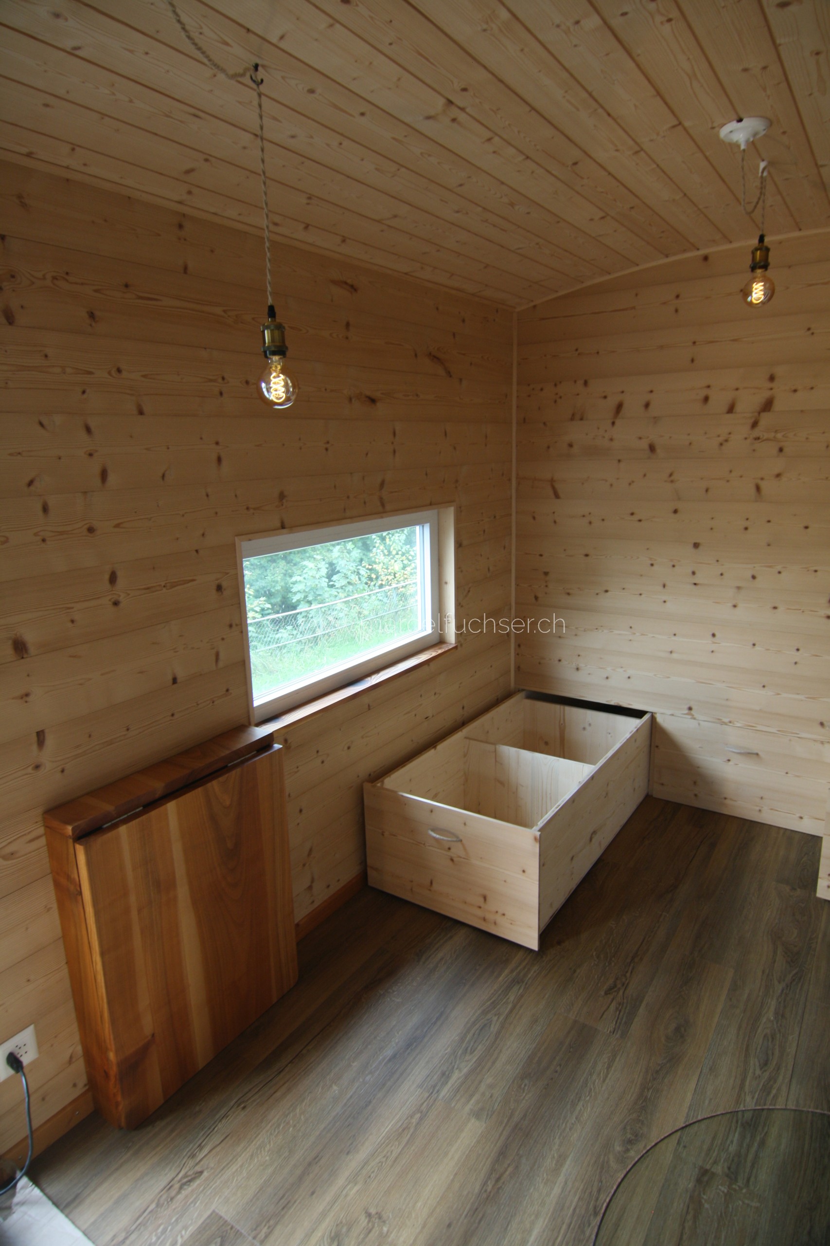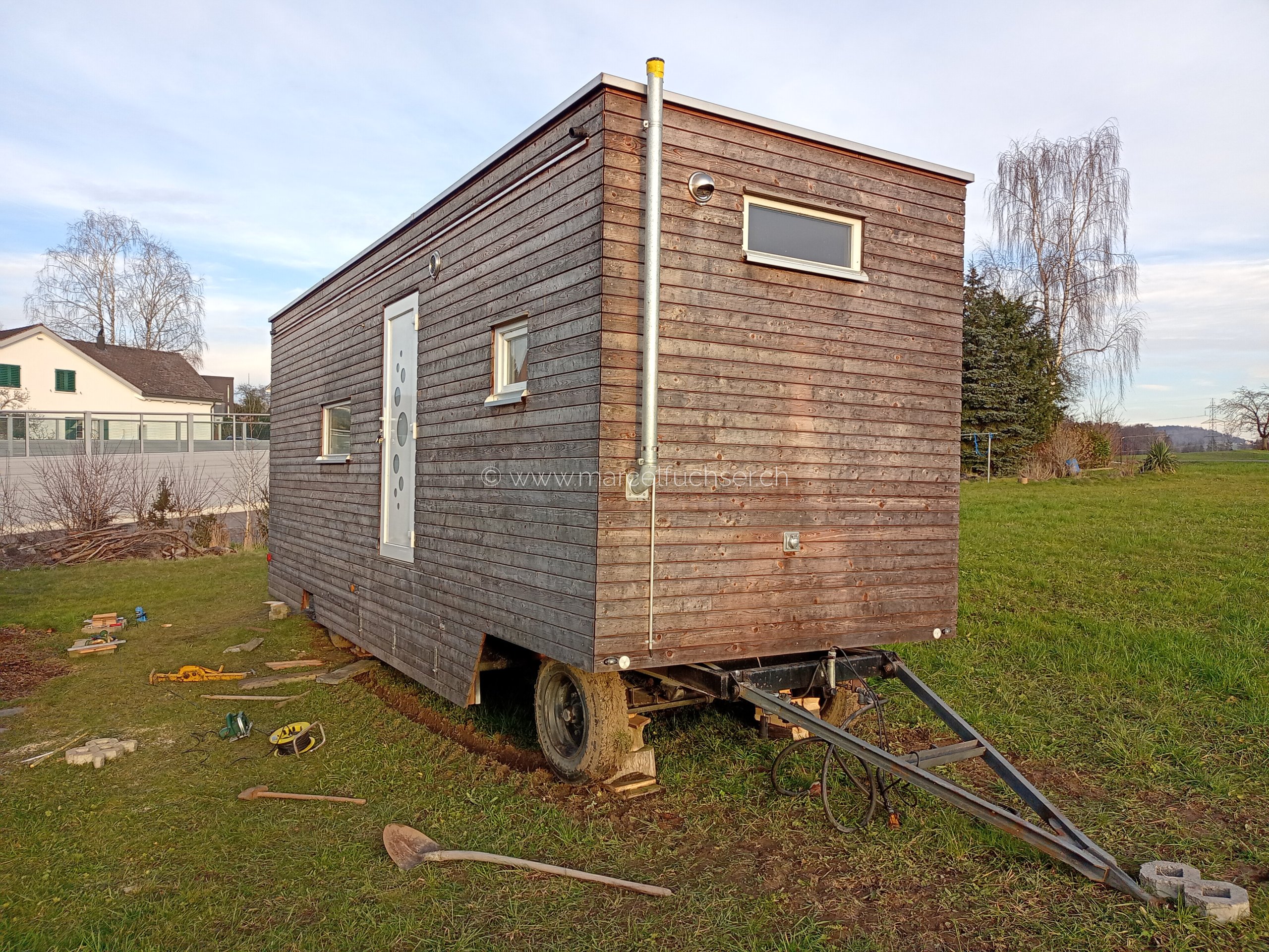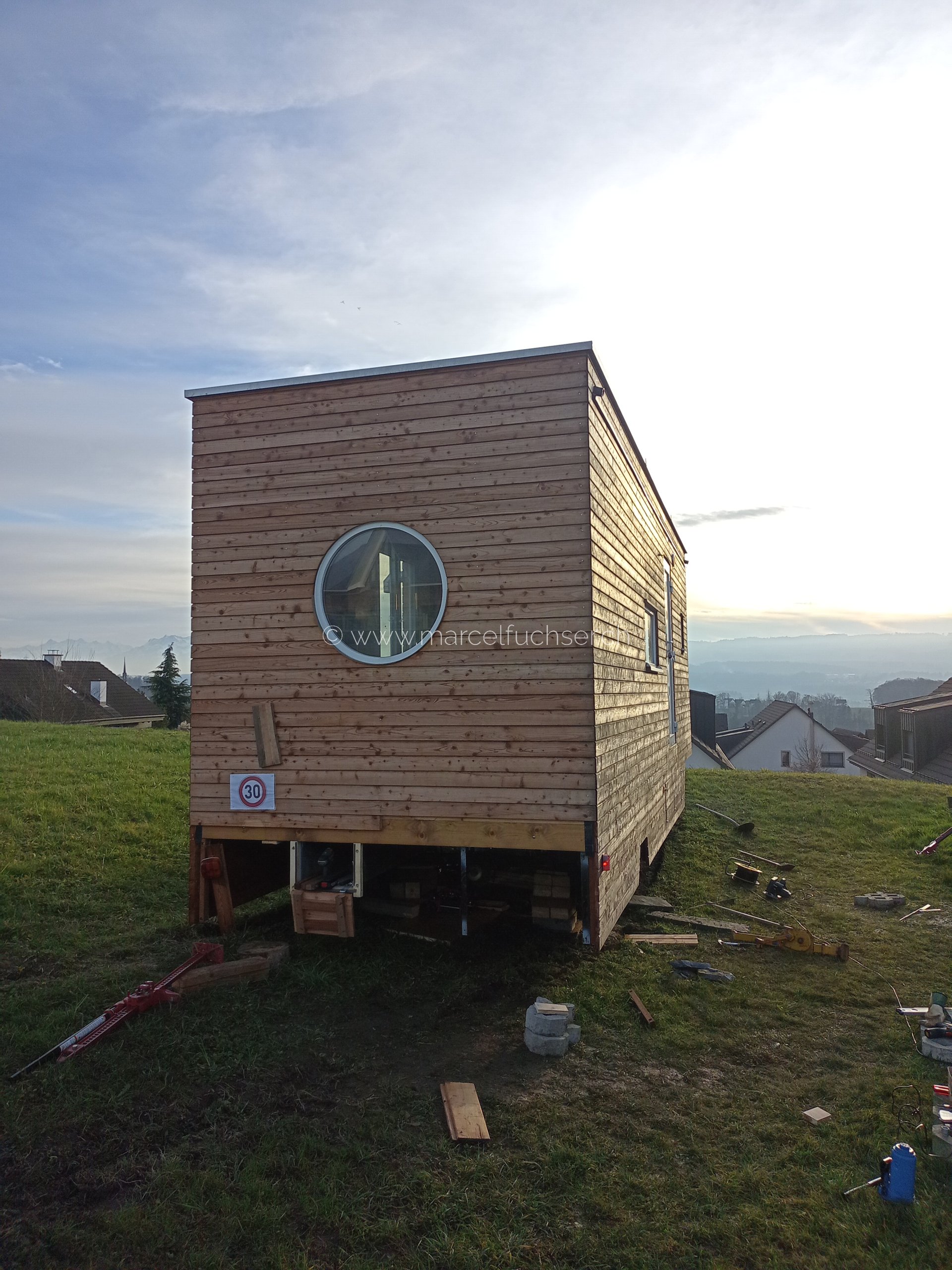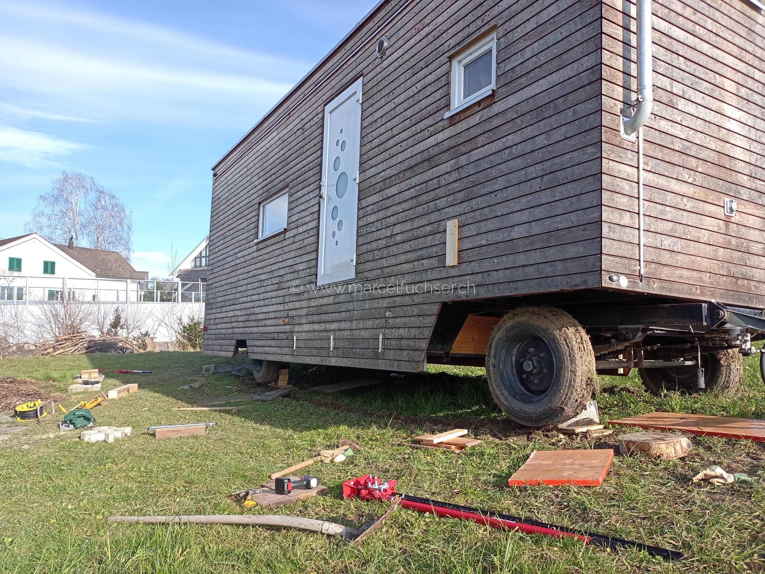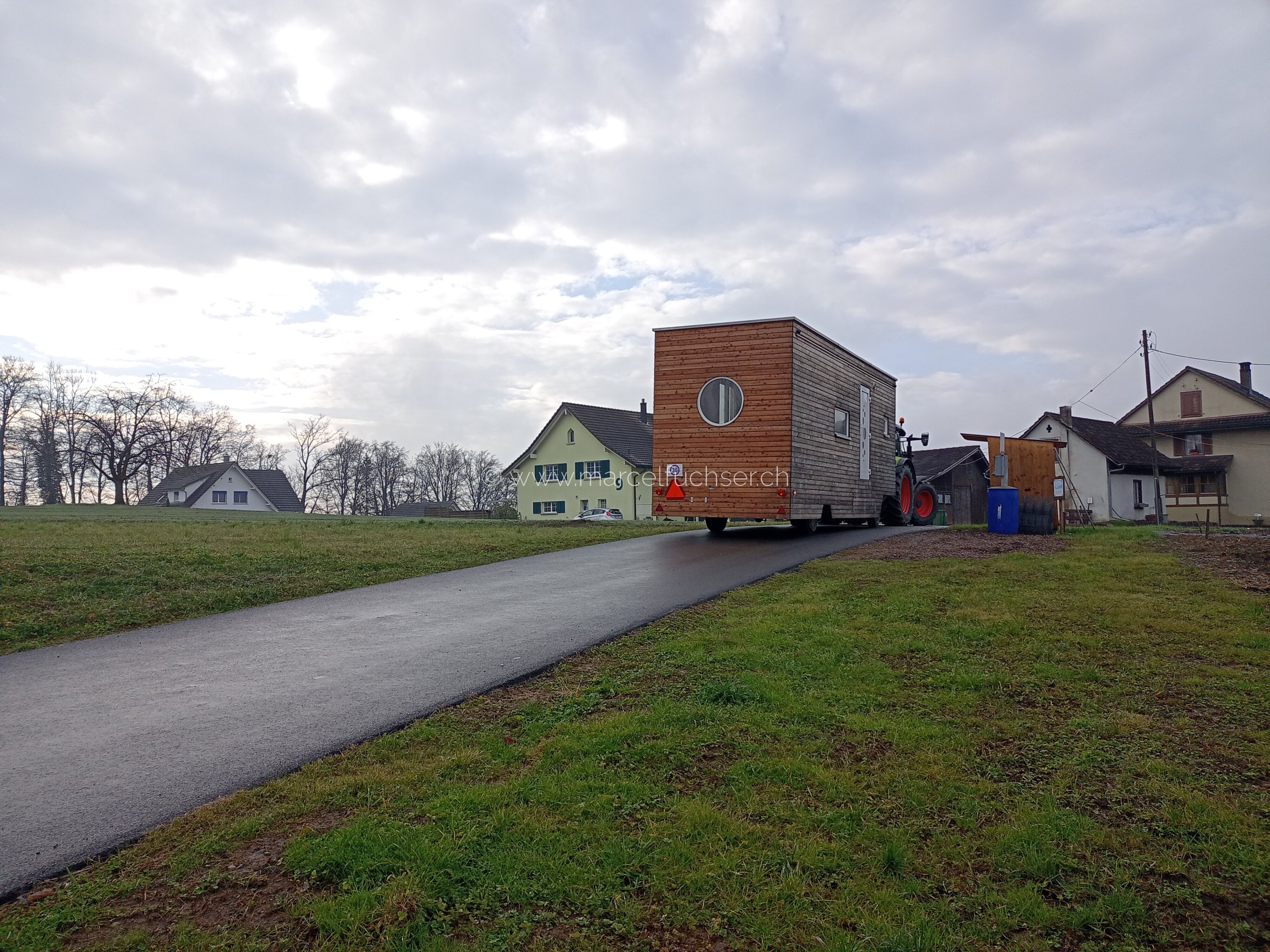 Nun war es so weit: Nach drei Jahren musste unser Tinyhouse der Zimmermannswerkstatt weichen, da der Platz für ein Hausbau benötigt wurde. Also musste ich kurzfristig auf die Suche nach einem neuen Stellplatz machen und wurde glücklicherweise fündig. Für eine unbestimmte Zeit dürfen wir unser Tinyhouse am neuen Standort parken, allerdings ohne darin zu wohnen. Da der Platz in der Nähe unseres Wohnortes liegt, ist es für uns nun umso praktischer, dort weiter am Tinyhouse zu arbeiten. In den kommenden Wochen werden wir das Tinyhouse etwas aufpeppen und einige Modifikationen vornehmen.