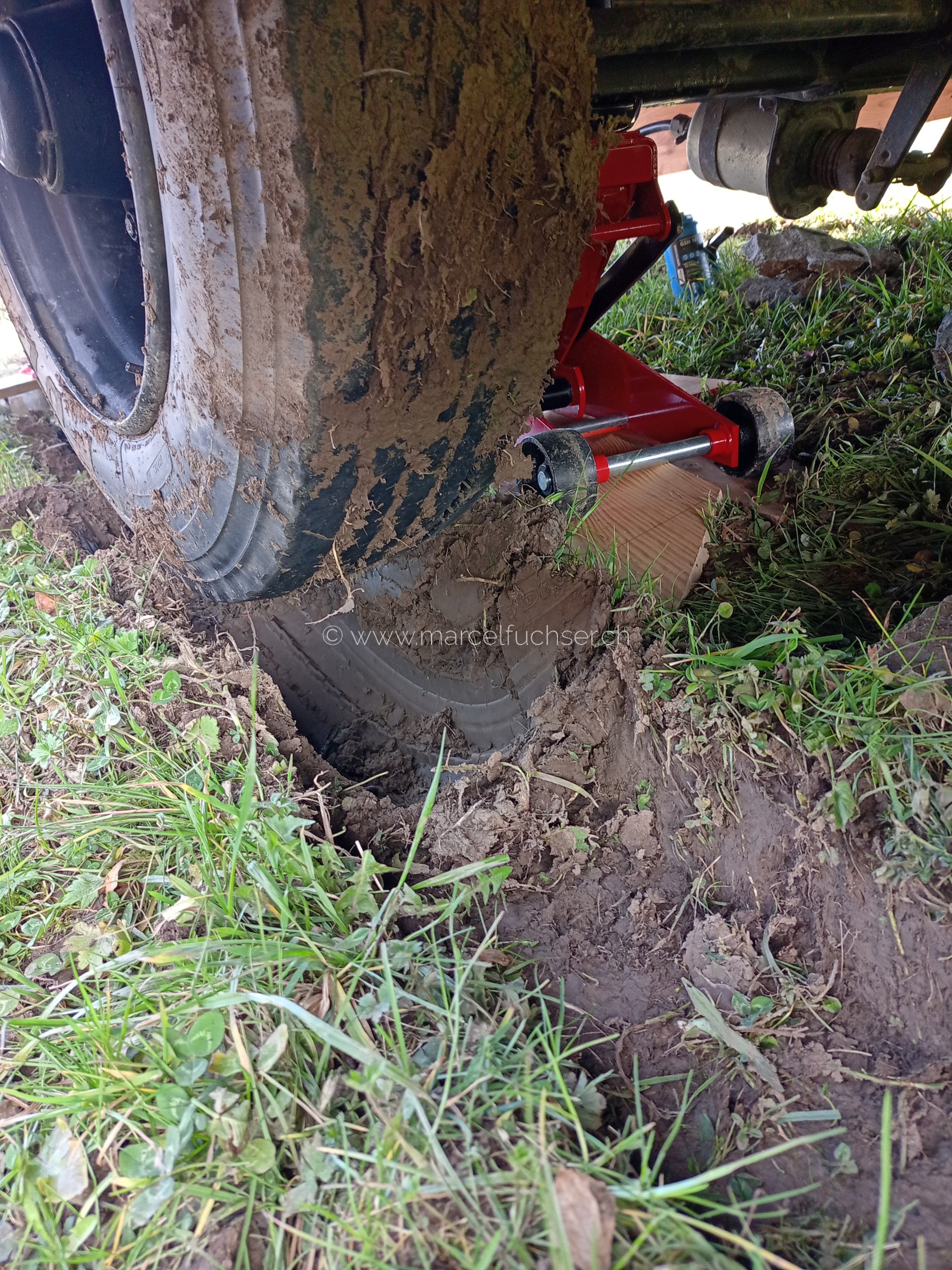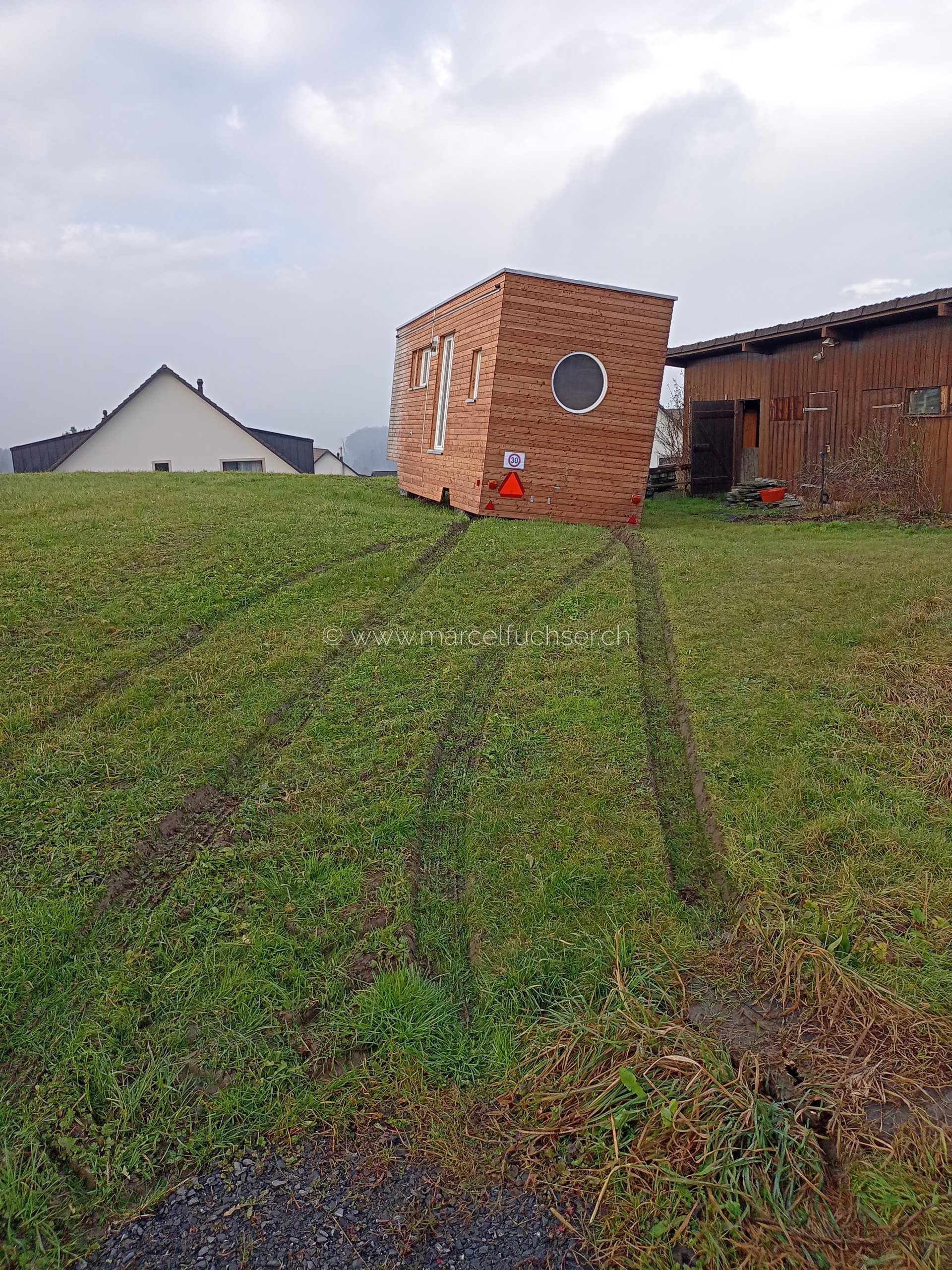 Ein hilfsbereiter Bauer erklärte sich bereit, unser acht Tonnen schweres Tinyhouse rund 60 km weit zu transportieren. Der Transport verlief erfreulich flott und ohne Zwischenfälle. Allerdings war die Wiese am Zielort an diesem Tag stark aufgeweicht. Ohne weiter darüber nachzudenken, wurde das das Tinyhouse direkt darauf parkiert – ein folgenschwerer Fehler. 🫣