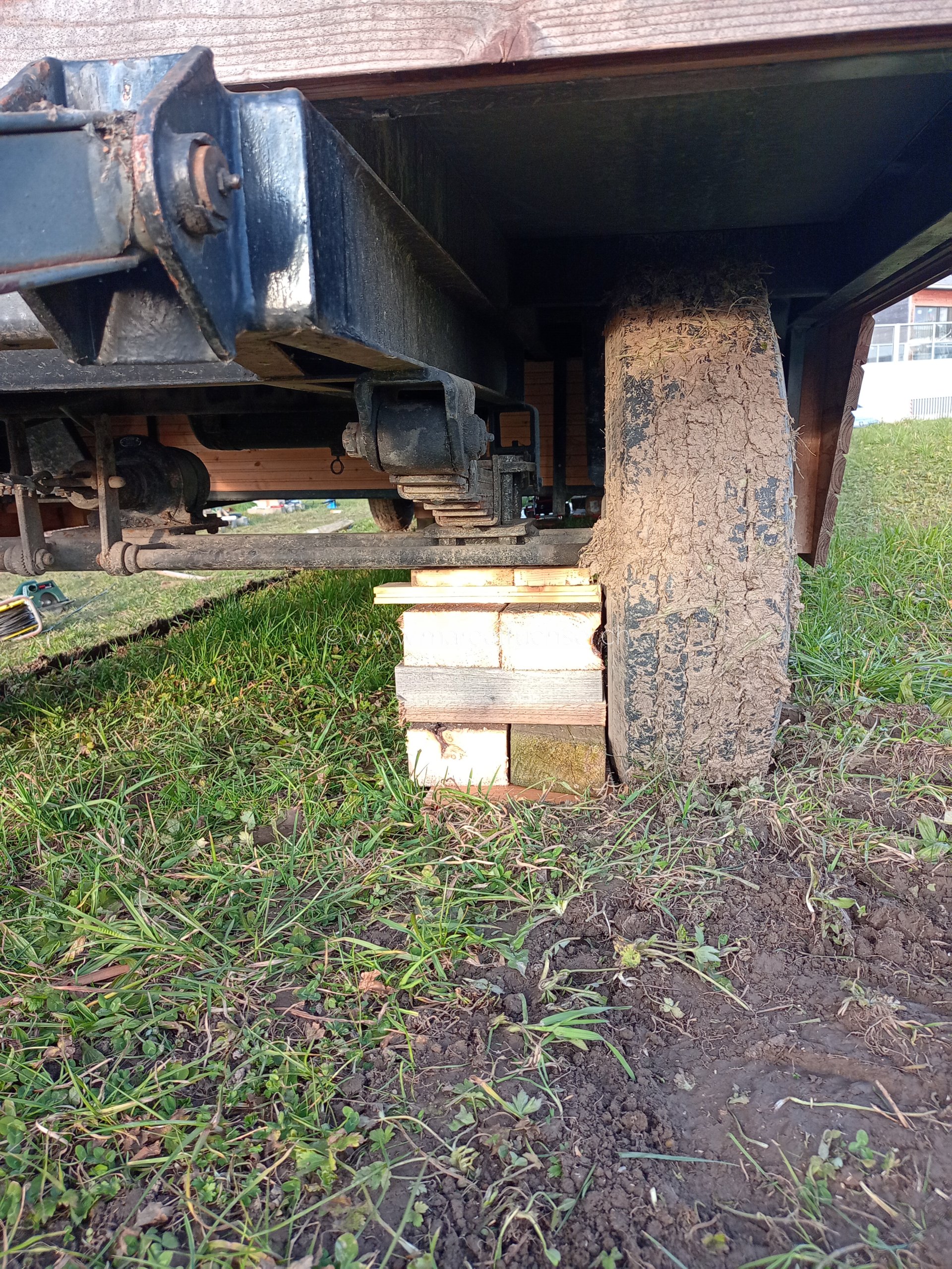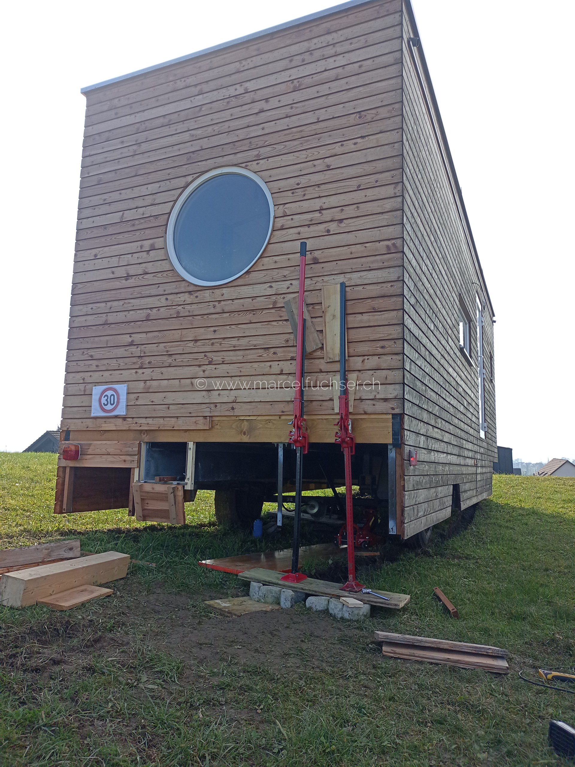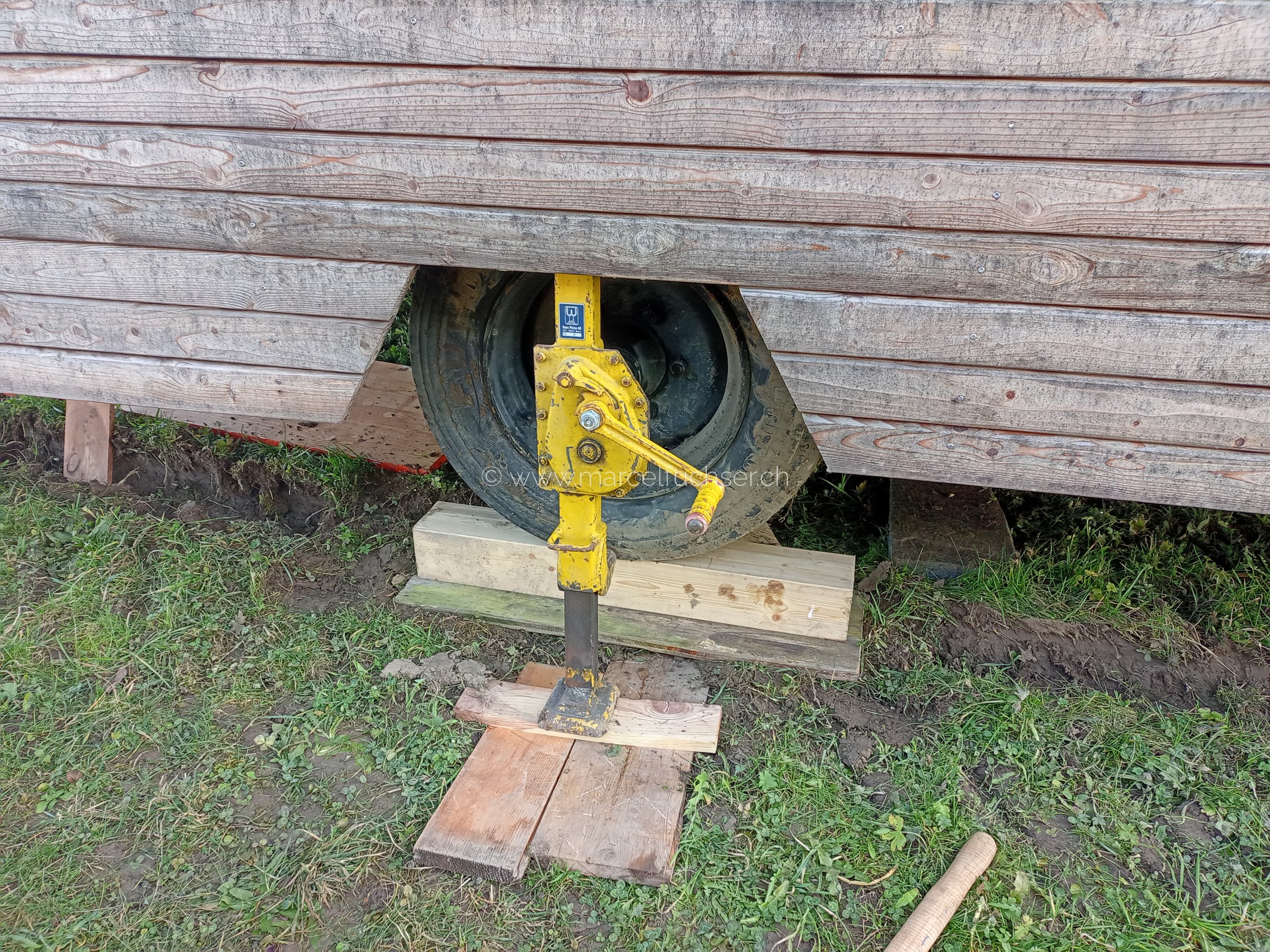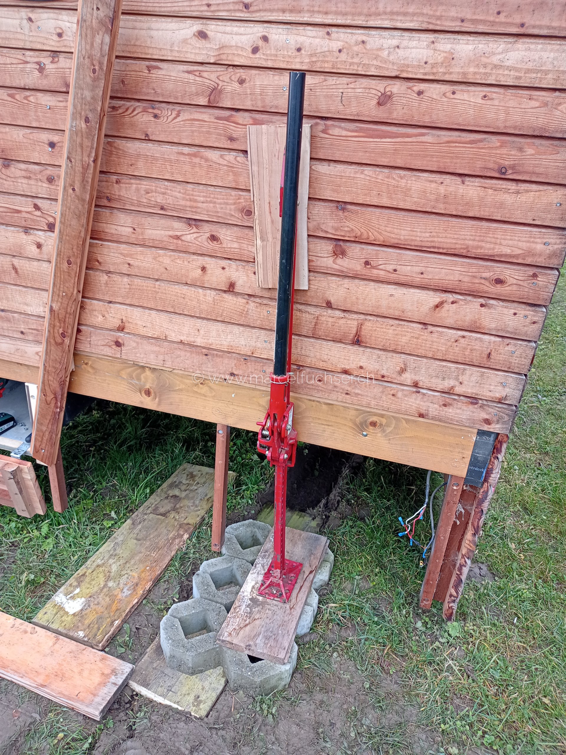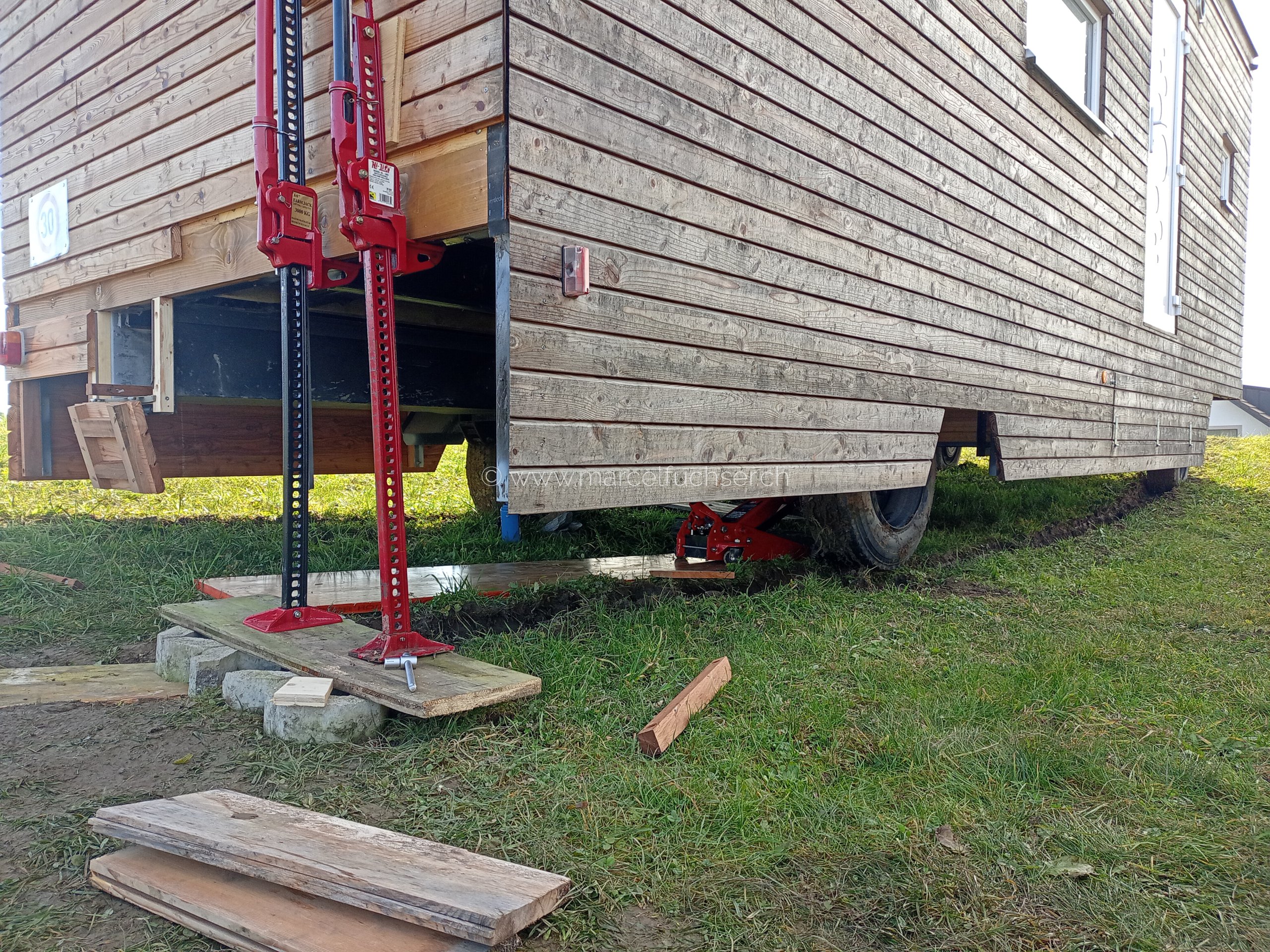 Ausgerechnet dort, wo sich das Wasser im Untergrund gesammelt hatte, ist das Tinyhouse stark eingesunken. So musste es mit einem Wagenheber angehoben werden, doch die ersten beiden Versuche scheiterten: Der weiche Boden gab nach, und die Wagenheber konnten das Gewicht nicht stemmen. Also musste das Ganze auf ein anderes Mal verschoben werden – mit einer besseren Vorbereitung und einer längeren Trockenphase.