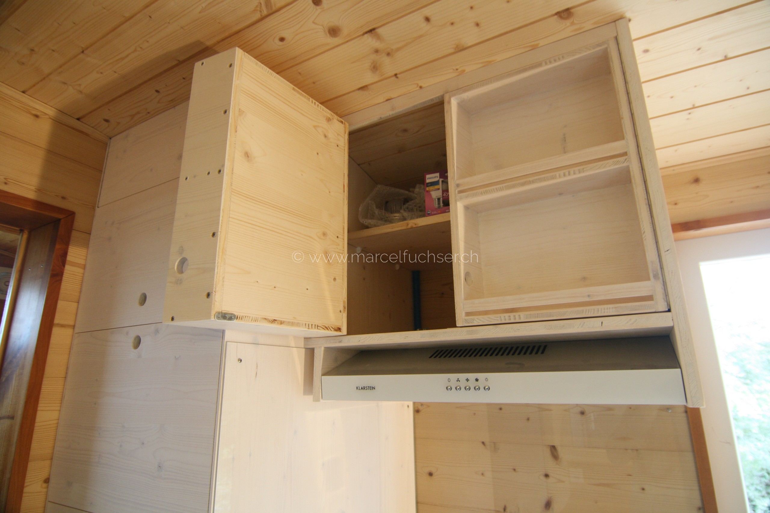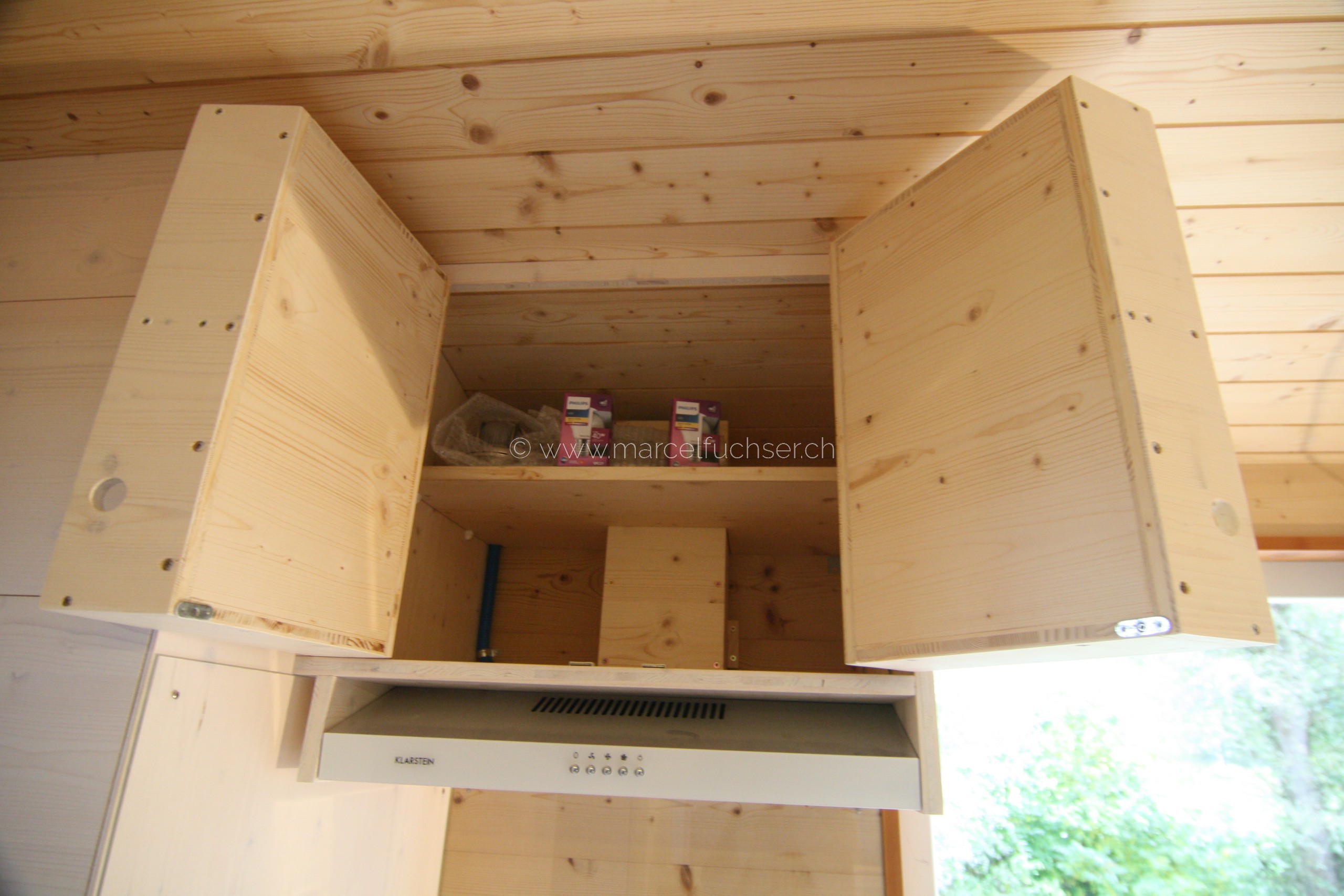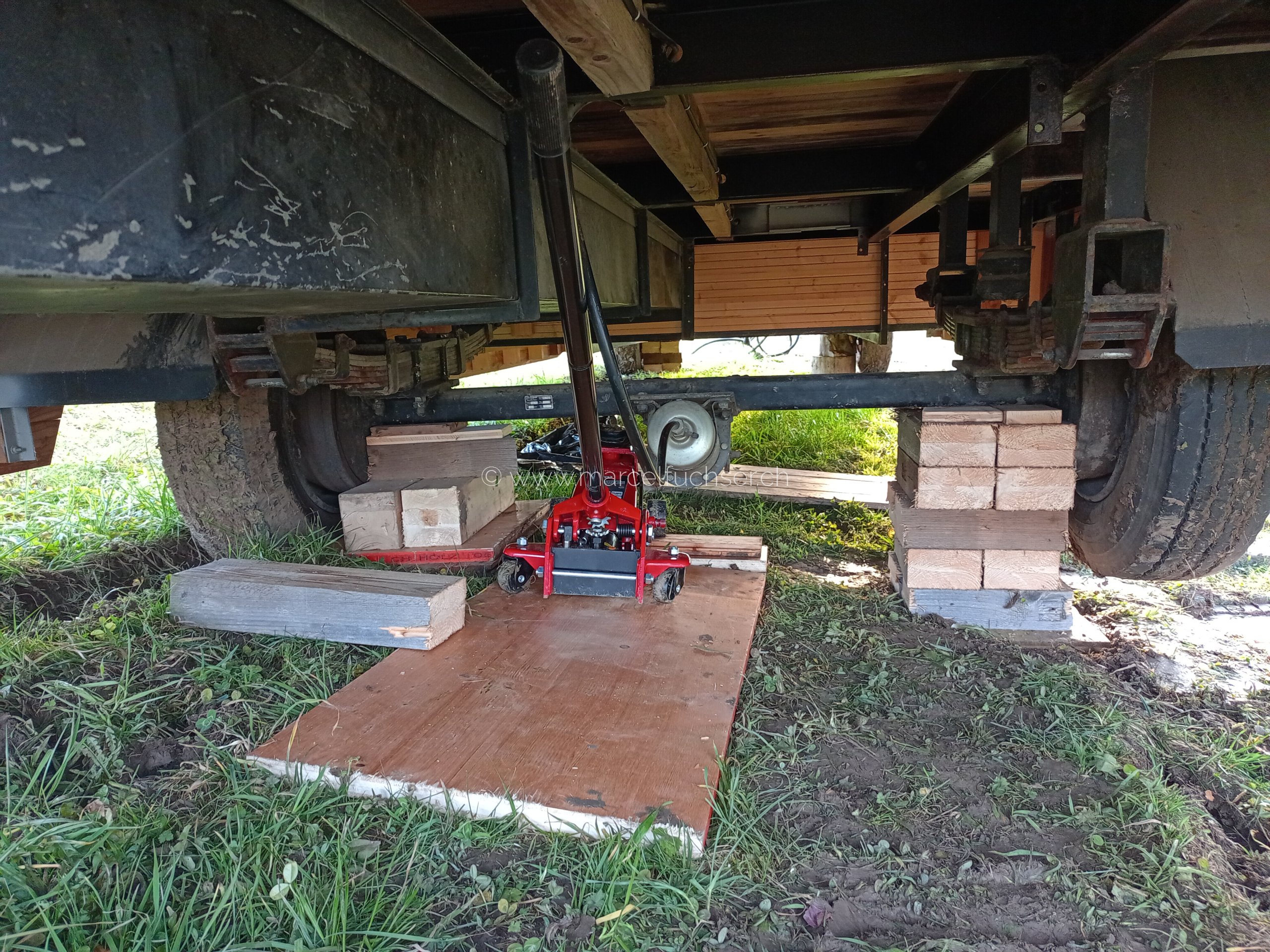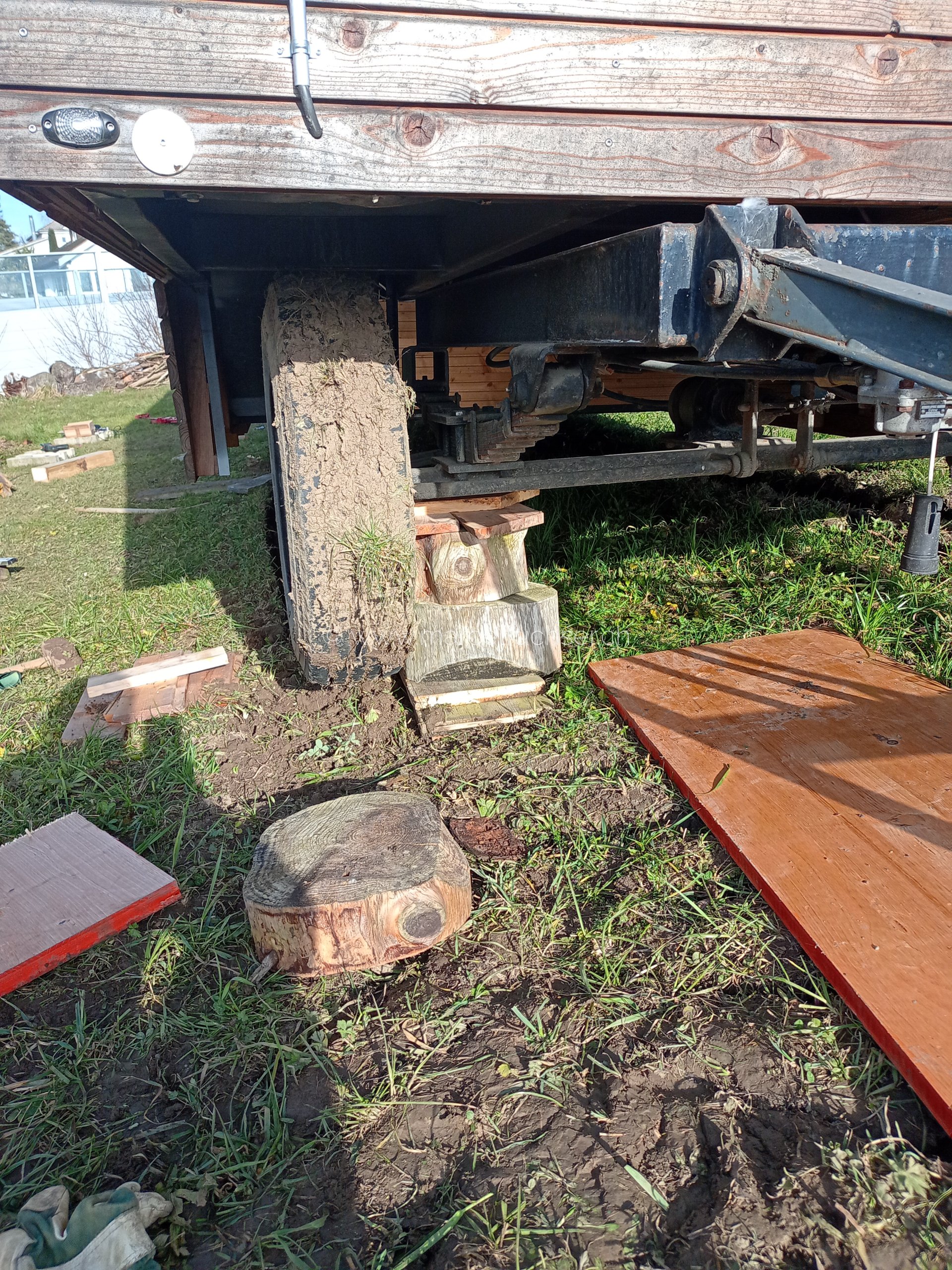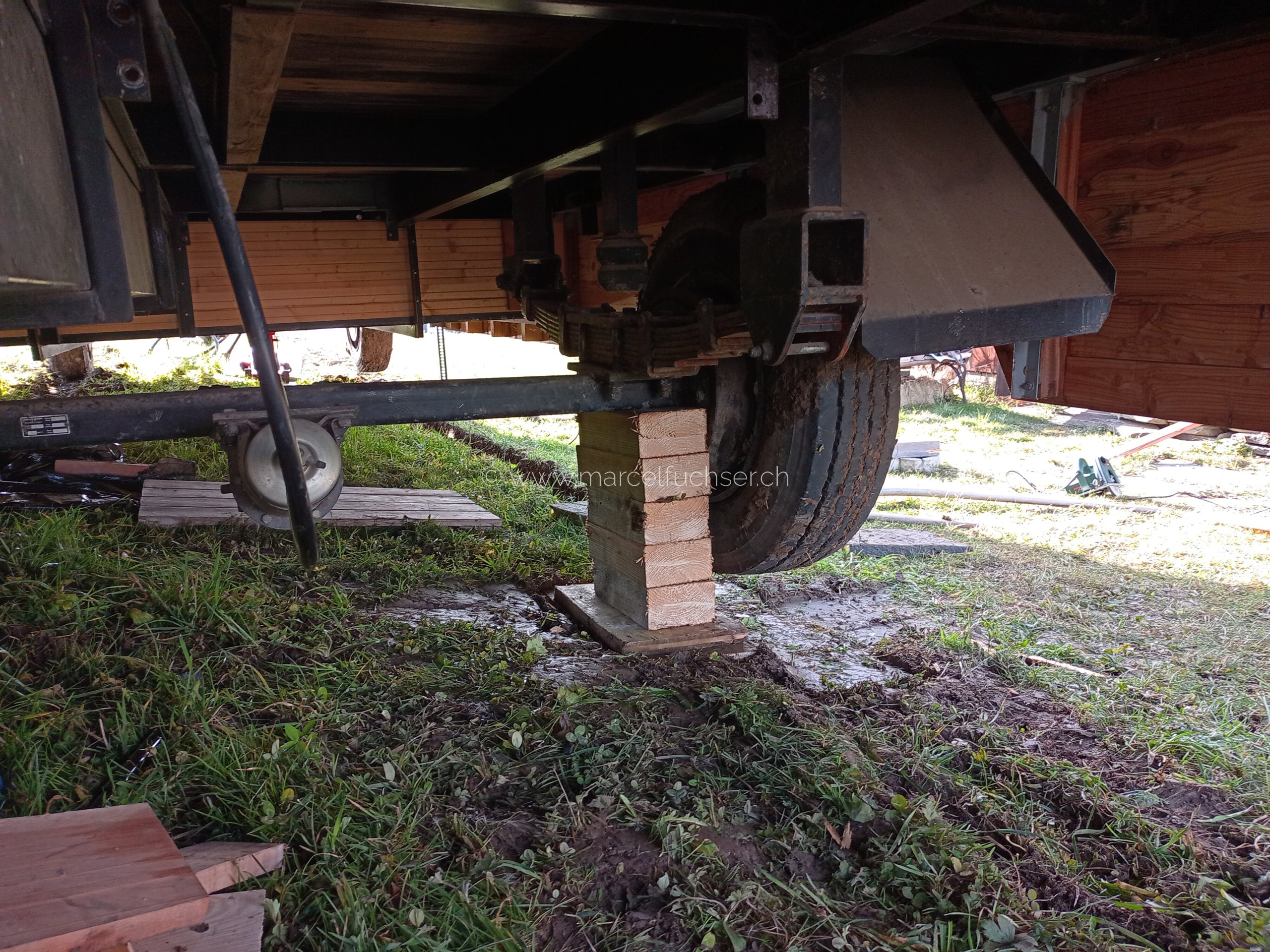 Ausgerechnet dort, wo sich das Wasser im Untergrund gesammelt hatte, ist das Tinyhouse stark eingesunken. So musste es mit einem Wagenheber angehoben werden, doch die ersten beiden Versuche scheiterten: Der weiche Boden gab nach, und die Wagenheber konnten das Gewicht nicht stemmen. Also musste das Ganze auf ein anderes Mal verschoben werden – mit einer besseren Vorbereitung und einer längeren Trockenphase.