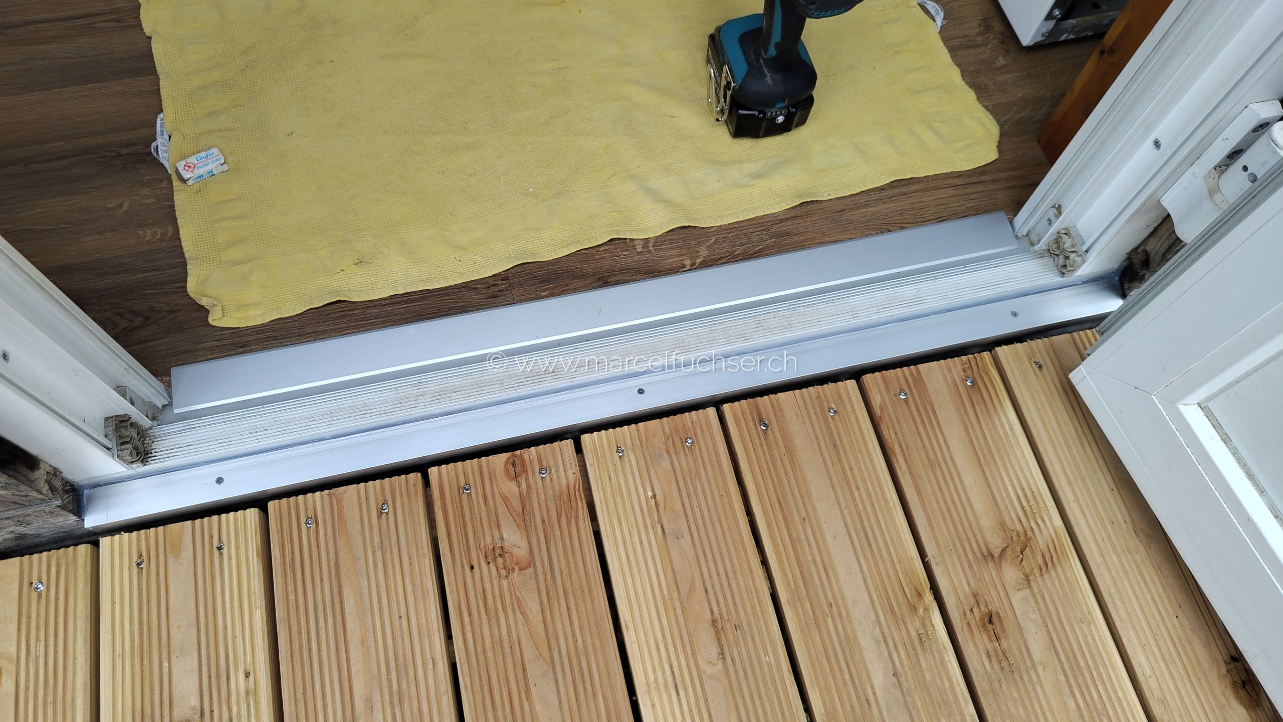 Beim Eingang hätte eigentlich eine Wetterschutzleiste montiert werden sollen. Es wurde pragmatisch mit einer einfachen Aluminium-Winkelleiste gelöst und sauber verfugt. So passt es auch.