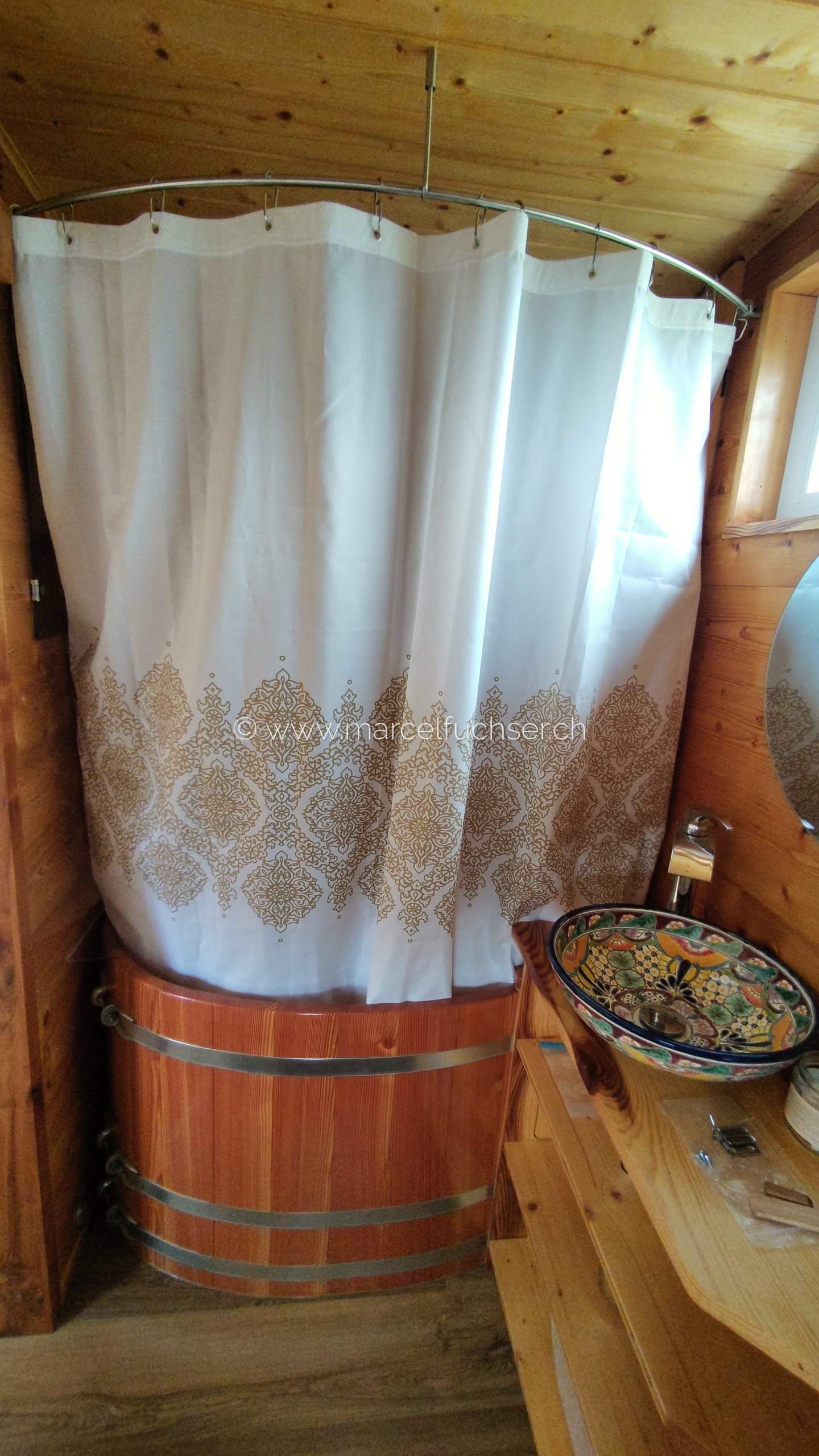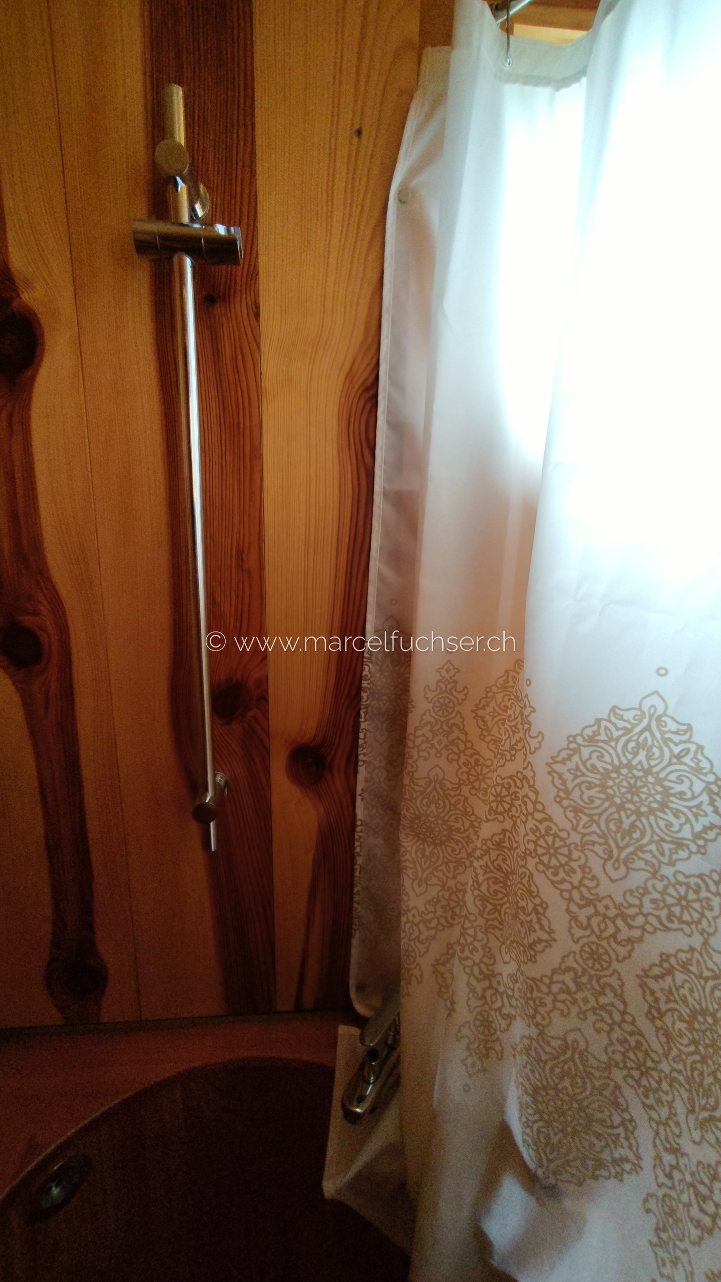 Im Duschbereich wurde der neue Duschvorhang zuvor passend zugeschnitten und mit Magneten versehen, damit man ihn beim Duschen einfach an der Wand positionieren bzw. andocken kann.